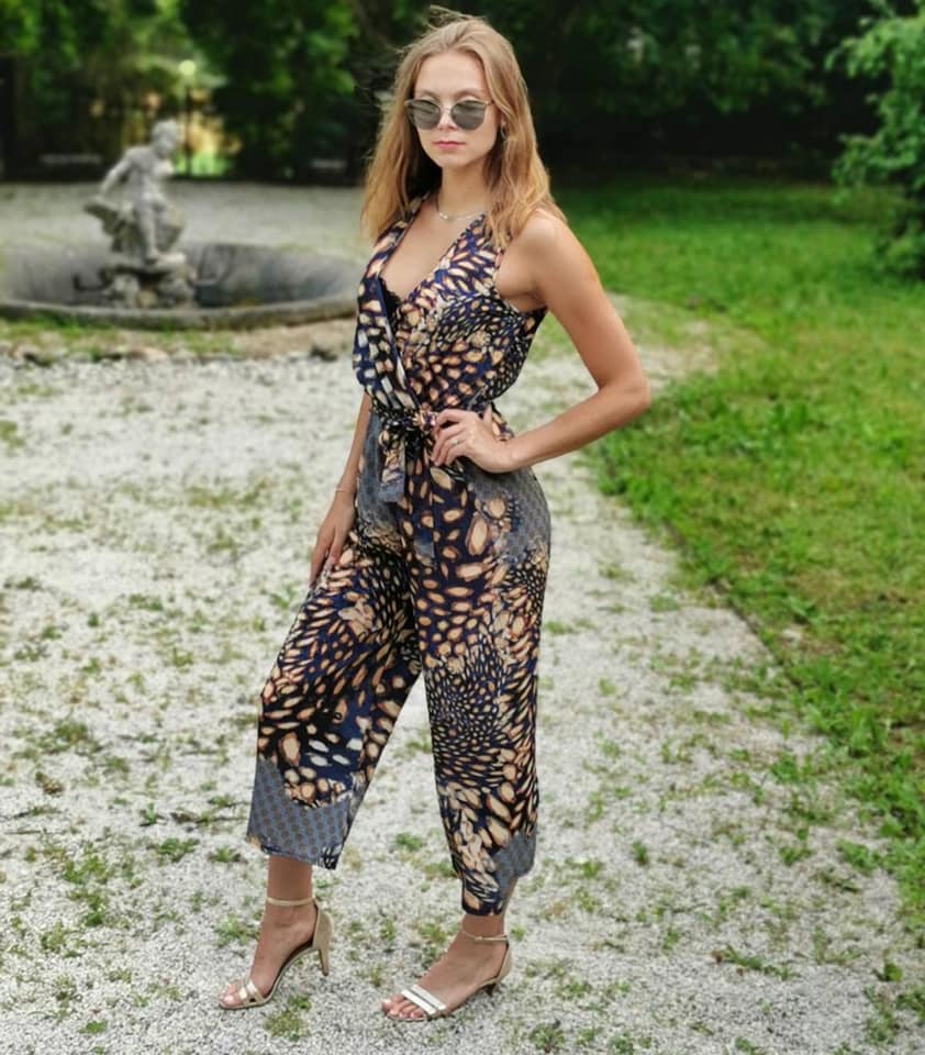 Poletni kombinezon na naramnice v tigrastem vzorcu.
